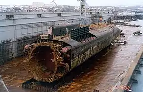 K-141 Kursk was a Project 949A class Antey (Russian: Aнтей, meaning Antaeus) submarine of the Oscar class, known as the Oscar II by its NATO reporting name, and was the penultimate submarine of the Oscar II class designed and approved in the Soviet Union. Construction began in 1990 at the Soviet Navy military shipyards in Severodvinsk, near Arkhangelsk, in the northern Russian SFSR. During the construction of K-141, the Soviet Union collapsed; work continued, and she became one of the first naval vessels completed after the collapse. In 1993 K-141 was named Kursk after the Battle of Kursk[2] in the 50-year anniversary of this battle. K-141 was inherited by Russia and launched in 1994, before being commissioned by the Russian Navy on December 30, as part of the Russian Northern Fleet.[3]