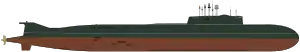 The outer hull, made of high-nickel, high-chromium stainless steel 8.5 mm (0.33 in) thick, had exceptionally good resistance to corrosion and a weak magnetic signature which helped prevent detection by U.S. magnetic anomaly detector (MAD) systems. There was a 200 mm (7.9 in) gap to the 50.8 mm (2.00 in)-thick steel pressure hull.[8] She was designed to remain submerged for up to 120 days. The sail superstructure was reinforced to allow it to break through the Arctic ice.[3] The submarine was armed with 24 SS-N-19/P-700 Granit cruise missiles, and eight torpedo tubes in the bow: four 533 mm (21 in) and four 650 mm (26 in). The Granit missiles with a range of 550 km (340 mi), were capable of supersonic flight at altitudes over 20 km (12 mi). They were designed to swarm enemy vessels and intelligently choose individual targets which terminated with a dive onto the target.[6] The torpedo tubes could be used to launch either torpedoes or anti-ship missiles with a range of 50 km (31 mi). Her weapons included 18 SS-N-16 "Stallion" anti-submarine missiles.[3]