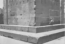 The structure stands on a three-tiered platform. The first tier is 27 centimetres (11 in) above the ground, and the tower is 14.12 metres (46 ft 4 in) high including the triple tiers or stairs of its platform. The base is square-shaped, with each side approximately 7.30 metres (24.0 ft) long. The ceiling of the structure is smooth and flat on the inside, but its roof has a bilateral slope that begins from the line in the middle of the rooftop on the outside, creating the pyramid-like appearance previously mentioned. The doorway is 1.75 metres (5 ft 9 in) high and 87 centimetres (34 in) wide and at one point had a very heavy two-panel door which is now missing. There are carved-out notches for the upper and lower heels of each door panel in the stone frame which are visible to modern observers.[9] Some have assumed that the door would have been made of wood, but a stone door, very similar to the remains of the one found in Ka'ba-ye Zartosht, exists in Solomon's Prison in Pasargadae, which indicates that both doors were made of stone.[10] The doorway leads to a single interior room. This space is quadrangular, has an area of 3.74 by 3.72 metres (12.3 by 12.2 ft), and is 5.5 metres (18 ft) high, with the thickness of its walls being between 1.54 and 1.62 metres (5 ft 1 in and 5 ft 4 in).[2]