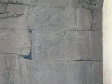 Ka'ba-ye Zartosht is cuboid in shape, and has only one entrance door, which leads inside its chamber by means of a stone stairway. There are four blind windows on each of its sides.[7] The stone used is white marbly limestone, and there are dentate shelves of black stone on its walls. The limestone blocks were brought from Mount Sivand, where they were quarried in a place called Na'l Shekan ("horseshoe breaker"), to Naqsh-e Rustam to build the Ka'ba.[5] These blocks were chiselled into large, mostly rectangular pieces and are put in place atop each other without using mortar; in some places, such as the rooftop, the stones are connected to each other by dovetail joints.[8] The size of the stones varies from 2.90 by 2.10 by 0.48 metres (9 ft 6 in by 6 ft 11 in by 1 ft 7 in) to 1.10 by 1.08 by 0.56 metres (3 ft 7 in by 3 ft 7 in by 1 ft 10 in); however in the west wall, there is a flat stone that is 4.40 metres (14 ft 5 in) long.[2]