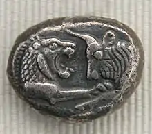 Lastly, the round coins in the Kabul hoard display a marked evolution in design: the series starts with simple round coins struck on the obverse and reverse with animal motifs reminding of the "western designs" of Croesus, or Achaemenid motifs.[49][48][47] In particular, the round coins which are considered the oldest in the hoard, have an obverse design consisting in the facing busts of two bulls,[50][48] evocative of the design of the mid-6th century coins of Croesus with the facing busts of a lion and a bull, generally considered as the first coins ever to be minted.[48][51] Other western designs include a stag, or double Persian column capitals.[47]