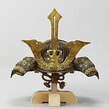 Kabuto are often adorned with crests called datemono or tatemono;[14] the four types of decorations were the maedate (frontal decoration), wakidate (side decorations), kashiradate (top decoration), and ushirodate (rear decoration). These can be family crests (mon), or flat or sculptural objects representing animals, mythical entities, prayers or other symbols. Horns are particularly common, and many kabuto incorporate kuwagata, stylized antlers.