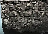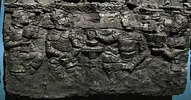 A calcinated wooden gate with elaborate decorations was discovered in 2017 in the throne room of the ruins of Kafir-kala, and was probably the gate to the throne room itself. The sculptures on the door represent adorations scenes for the goddess Nana, who stand centrally on a lion throne.[8]