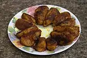 The snacks include unnakkaya (deep-fried, boiled ripe banana paste covering a mixture of cashew, raisins and sugar),[59] pazham nirachathu (ripe banana filled with coconut grating, molasses or sugar),[59] muttamala made of eggs,[57] chatti pathiri, a dessert made of flour, like a baked, layered chapati with rich filling, arikkadukka,[60] and more.[57]