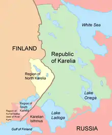 Karelia (Karelian and Finnish: Karjala [ˈkɑrjɑlɑ]; Russian: Каре́лия, romanized: Kareliya [kɐˈrʲelʲɪjə], historically Коре́ла, Korela [kɐˈrʲelʲə]; Swedish: Karelen [kɑˈreːlen]) is an area in Northern Europe of historical significance for Russia (including the Soviet era), Finland, and Sweden. It is currently divided between northwestern Russia (the federal subjects of the Republic of Karelia and Leningrad Oblast) and Finland (the regions of South Karelia, North Karelia, and the eastern portion of Kymenlaakso).
