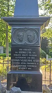 Duke Karl died at the age of 65 on 24 October 1878 at Glücksburg Castle.[1][5][6] His marriage with Vilhelmine Marie was without issue,[6] and many believe that she was barren as there are no records of her having any miscarriages or stillbirths. Upon his death, the ducal title was therefore inherited by Duke Karl's younger brother, Friedrich. Duke Karl was interred at Glucksburg Castle.[5] Duchess Vilhelmine Marie survived her husband by 12 years and died on 30 May 1891 at Glücksburg Castle.