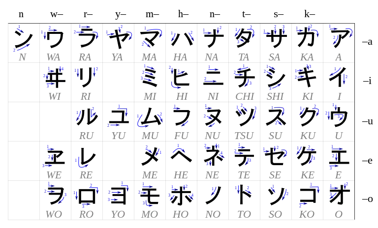 This is a table of katakana together with their Hepburn romanization and rough IPA transcription for their use in Japanese. Katakana with dakuten or handakuten follow the gojūon kana without them.