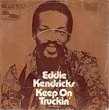 "Keep On Truckin'" is a 1973 hit song recorded by Eddie Kendricks for Motown Records' Tamla label. The clavinet-featuring song was Kendricks' first major hit as a solo artist, coming two years after his departure from The Temptations. "Keep On Truckin'" reached number one on both the Billboard Hot 100 and R&B Singles Chart upon its release, and was Kendricks' only number-one solo hit.[3] It also reached #18 on the UK Charts.[4] Vibes are played by Gary Coleman.