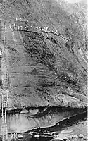 Benguet Road construction crew near Camp 5, Tuba, Benguet ca1903 setting explosives into a sheer cliff of the Bued River Canyon.