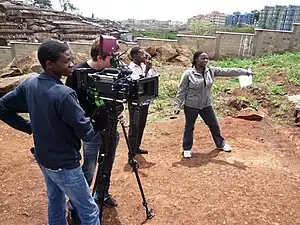 Filmmaker Nathan Collett (with camera) shooting feature film Togetherness Supreme in collaboration with Kibera youth trainees.