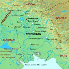 Under the Parthians, Khuzistan was known as Elymais,[4] a Parthian sub-kingdom, which in c. 221 was defeated and conquered by the Persian prince Ardashir I, who would later overthrow the Parthians and establish the Sasanian Empire.[5][6] Khuzistan is attested as a province in the Ka'ba-ye Zartosht inscription of the second Sasanian King of Kings (shahanshah) Shapur I (r.240–270). There it is mentioned right after Pars and Parthia, the country of the Sasanians and Parthians respectively, which demonstrates its importance.[7] The prominent Zoroastrian priest Kartir likewise mentions the province in his inscription at Naqsh-e Rajab.[8] In c.260, Shapur I founded the city of Gundeshapur (Middle Persian: Weh-Andiōk-Šābuhr), which was established in a village called Pilabad, situated between Susa and Shushtar. The city, constructed as a place to settle Roman prisoners of war, subsequently became a Sasanian royal summer residence and the capital of Khuzistan.[9] Shapur I's son and successor, Hormizd I (r.270–271) founded two cities in Khuzistan; Hormizd-Ardashir and Ram-Hormizd.[10][11] During the reign of Bahram II (r.274–293), a high-priest (mowbed) revolted in Khuzistan and briefly occupied the province.[12]
