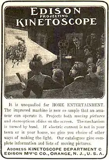 Departing the Vitascope operation after little more than a year—in which the Edison Company's film-related business made a $25,000 profit—Edison commissioned the development of his own projection systems, the Projectoscope and then multiple iterations of the Projecting Kinetoscope, eventually targeting semiprofessional and amateur customers.[102] At its peak, around 1907–8, the Projecting Kinetoscope commanded 30 percent of US projector sales.[103] In 1912, Edison introduced the ambitious Home Projecting Kinetoscope, which employed a unique format of three parallel columns of sequential frames on one strip of film—the middle column ran through the machine in the reverse direction from its neighbors. It was a commercial failure.[104] Three years later, the Edison operation came out with its last substantial new film exhibition technology, a short-lived theatrical system called the Super Kinetoscope.[103] Aside from the actual Edison Studios film productions, the company's most creative work in the motion picture field from 1897 on involved the use of Kinetoscope-related patents in threatened or actual lawsuits for the purpose of financially pressuring or blocking commercial rivals.[105]