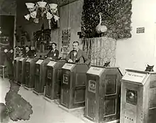 The Kinetoscope was also gaining notice abroad. On July 16, 1894, it was demonstrated publicly for the first time in Europe at the 20 boulevard Montmartre newsroom of Le petit Parisienne, where photographer Antoine Lumière may have seen it for the first time.[70] In September, the first Kinetoscope parlor outside the United States opened in Buenos Aires, Argentina.[71] The first European Kinetoscope parlor was soon operating in Paris, at 20 boulevard Poissonnière. One of the owners was a business associate of Antoine Lumière's, whom he gave a strip from Barber Shop and a request for cheaper alternatives to the expensive Edison-produced films he was showing. Along with the stir created by the Kinetoscope itself, this was one of the primary inspirations for the Lumière brothers, Antoine's sons, who would go on to develop not only improved motion picture cameras and film stock but also the first commercially successful movie projection system.[72] In mid-October, a Kinetoscope parlor opened in London.[73] At the end of November, by which point New York City was host to half a dozen Kinetophone parlors and London to nearly as many, a venue with five machines opened in Sydney, Australia. By January 3, 25,000 filmgoers had paid the one-shilling fee (roughly equivalent to 25 cents, the same price for five film viewings as in the New York debut).[74]