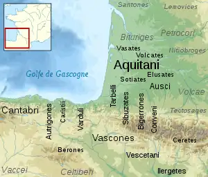 The kingdom originated in the southern side of the western Pyrenees, in the flatlands around the city of Pamplona. According to Roman geographers such as Pliny the Elder and Livy, these regions were inhabited by the Vascones and other related Vasconic-Aquitanian tribes, a pre-Indo-European group of peoples who inhabited the southern slopes of the western Pyrenees and part of the shore of the Bay of Biscay.[11] These tribes spoke an archaic version of the Basque language, usually known by linguistics as Proto-Basque, as well as some other related languages, such as the Aquitanian language. The Romans took full control of the area by 74 BC, but unlike their northern neighbors, the Aquitanians, and other tribes from the Iberian Peninsula, the Vascones negotiated their status within the Roman Empire.[12] The region first was part of the Roman province of Hispania Citerior, then of the Hispania Tarraconensis. It would be under the jurisdiction of the conventus iuridicus of Caesaraugusta (modern Zaragoza).