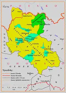 The Spiš (Zips) region. Light blue and green areas show the pawned territories, red line shows current borders, yellow former border between then Hungary and Poland and the black borders between counties