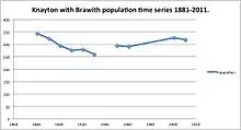 With a population of 318[1] and 148 households,[5] Knayton with Brawith is a moderately sized civil parish. The average age of the population is 48.4,[6] coupled with the largest age group being 45-59, proves that the population is of working age. The second largest age group is 65 to 74, therefore newly retired and portrays the ageing population of the country. The lowest age group is 18 to 19 showing that many young people move away so to access higher education or occupations. The population has fluctuated slightly, as seen by the population time series. However, the population has remained similar to the 1881 population of 344.[7]