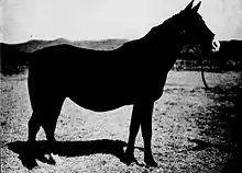 According to Bedouin traditions described by Rzewuski, "Koheyléh" was one of the five mares who returned despite their thirst when the Prophet Muhammad pronounced their name.[6] He is said to have smeared their eyes with kohl, hence their name and that of their offspring, "Koheilan".[6] Koheilan horses are considered to be direct descendants of the Al Khamsa (الخمسة), Muhammad's five favorite mare lines,[4] which Bedouin nomads see as the origin of the Arabian breed, with the quality of belonging or not to the line being transmitted through the mother brood mare.[7][8] In fact, the names of these bloodlines often derive from the Bedouin family who bred them.[9] Orientalist Aleksander Chodźko notes that Koheilan are considered the finest Arabian horses.[10] Bedouin belief attributes to these horses the ability to choose the best path for their rider, thanks to hippomancy.[3]