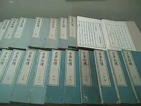 The Kojiki received its most serious study and exposition in the hands of Motoori Norinaga, who obtained a copy of the Kan'ei printed edition in 1754. After meeting Mabuchi in 1763, Norinaga began to devote his efforts to an in-depth scholarly study of the text. A monumental 44-volume study of the Kojiki called Kojiki-den (古事記伝, "Commentary on the Kojiki"), composed over a 34-year period (1764–1798), was the fruit of his labor.[16] With Norinaga, the Kojiki assumed an importance equal to the Nihon Shoki; in fact, in his view the Kojiki was a more trustworthy source for ancient Japanese traditions than was the Shoki precisely because it was free of "Chinese mentality". He viewed the Kojiki as a true account of actual events that when read correctly, could reveal Japan in its pristine, ideal state as a community where the kami, the emperor and the people lived in harmony.[16][19] Norinaga's work was carried on in different directions by his disciple Hirata Atsutane and his rivals Fujitani Mitsue (1781–1849)[20] and Tachibana Moribe (1768–1823),[21] who each produced commentaries and treatises on the text.[16]