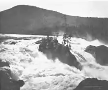As early as 1898, without building a dam, the original Lower Bonnington Power Plant was generating hydroelectricity from Bonnington Falls in the Kootenay River near the confluence of the Slocan River in order to supply water to mines in Rossland, British Columbia.[111][112] For Upper Bonnington, the first dam built on the river, the original goal was to improve navigation between Kootenay Lake and the Kootenay's mouth on the Columbia by drowning the dangerous Bonnington Falls rapids that also blocked fish migration, and hopefully introducing fish to the upper river by constructing a fish ladder. None of these amenities for steamboats or salmon were ever constructed — in fact, the dam ended up being built above the falls instead of below them— and Upper Bonnington Dam, when completed in 1906, only generated hydroelectric power, and has served that purpose ever since.[112][113]