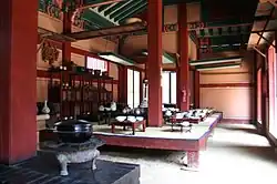 The sura (수라) were the main meals of the day. Breakfast was served at ten in the morning and the evening meals were served between six and seven at night. The set of three tables (surasang, 수라상), were usually set with two types of rice, two types of soup, two types of stew (jjigae), one dish of jjim (meat stew), one dish of jeongol (a casserole of meat and vegetables), three types of kimchi, three types of jang (장) and twelve side dishes, or called 12 cheop (12첩). The meals were set in the suragan (수라간), a room specifically used for taking meals, with the king seated to the east and the queen to the west. Each had their own set of tables and were attended by three palace servant women known as sura sanggung (수라상궁). These women would remove bowl covers and offer the foods to the king and queen after ensuring that the dishes were not poisoned.[6]