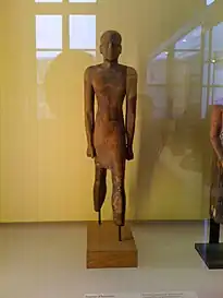Kouroi are beardless, take a formulaic advancing posture, and are most often nude.[lower-alpha 3] Taking from the style of Egyptian figures, Greek kouroi often have their left leg extended forward as though walking; however, the figurine looks as though it could be either standing still or taking a long stride.[22] A small number of early kouroi are belted around their waists, a practice that died out at the turn of the sixth century. Such belts have traditionally been assumed to be an abbreviated symbol of a more complex costume,[23] however fully clothed contemporary figures also exist, suggesting that it was not just a sculptor's shorthand for clothing but a signifier in itself. Art historian B.S. Ridgway[16]:72–73 suggests that this may have been an attribute of Apollo, athleticism or magical powers, though its iconography remains obscure. Further, there is the question of the nudity of the kouros and if this is also an attribute. Again this may have represented athletic or heroic nudity – immortalising the youth as he appeared in the palaestra, but no examples have been found at Olympia nor do they bear any allusion to athletic equipment.