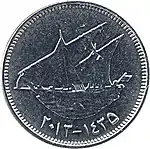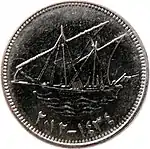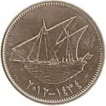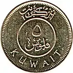 The coins in the following table were introduced in 1961. The design of all coins is similar and has not changed since they were first minted. On the obverse is a boom ship, with year of minting in both Islamic and Common Era in Arabic. The reverse contains the value in Arabic within a central circle with الكُوَيت (Arabic for The Kuwait) above and KUWAIT in English below.