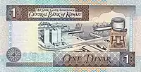 KD 1 Coat of arms of Kuwait; Vignette of a traditional Oil Lamp; Vignette of Kuwait Towers Vignette of Mina Al-Shuwaikh; Vignette of a traditional Water Storage Vessel on Stand