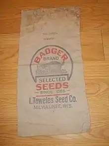 Teweles Seed was known for branding their seeds. Forage seeds were initially sold with a grade of "prime", "choice" or "fancy" until Hugo Teweles, a zoo buff, proposed in the 1920s to brand the seed grades with the Badger brand as the top quality and Buffalo and Elk brands as the two lesser qualities.[2] The firm differentiated itself by selling seed in smaller bags, 60 pounds for alfalfa, clovers, etc. and 45 pounds for timothy-grass, with orchard and brome grass in 50-pound bags, about half the size of the industry's standard packaging.[2] The slogan for the Badger brand in the 1950s was "More PURE-LIVE seed for your money."[6]
