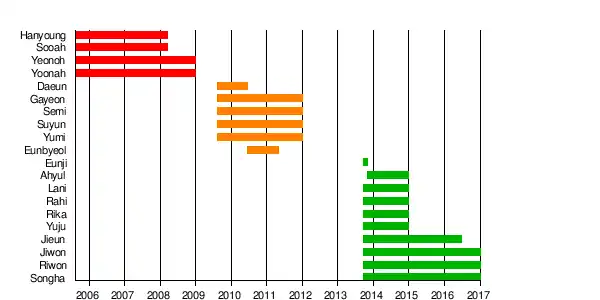 On March 19, 2008, it was announced that Hanyoung and Sooah would be leaving the group due to their individual projects; the management group said that new members would be chosen.[3] In 2009 the band returned with new members.[4]
