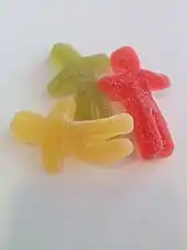 Laban is a jellyman, which is one of the stretchy gummy candies that looks like an overly plump stick figure. This candy is made by Nidar AS since 1965.[2] It was introduced to the Indian market in 2017, the first time the brand was exported outside Norway.[3]