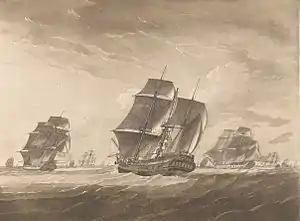 ![]() Robert Dodd: Lady Juliana in tow of the Pallas Frigate. The Sailors Fishing the main Mast which was shatter'd by Lightning. | |