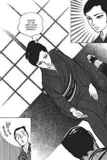 In chapter 3, a child is born in a women's prison. The mother suffers terribly while giving birth but before dying, she tells the tale of how her husband and son were murdered and she was brutally raped. She escaped their clutches by killing one of her tormentors, Tokuichi Shoei, but was caught by the police and sentenced to life imprisonment. This child, Oyuki, is cursed to carry out the vengeance her mother was unable to. This is where the reader learns Lady Snowblood's true name.