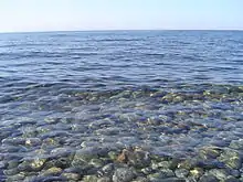 Baikal is one of the clearest lakes in the world.[13] During the winter, the water transparency in open sections can be as much as 30–40 m (100–130 ft), but during the summer it is typically 5–8 m (15–25 ft).[26] Baikal is rich in oxygen, even in deep sections,[26] which separates it from distinctly stratified bodies of water such as Lake Tanganyika and the Black Sea.[27][28]