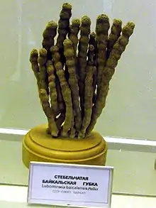 At least 18 species of sponges occur in the lake,[71] including about 15 species from the endemic family Lubomirskiidae (the remaining are from the nonendemic family Spongillidae),[72][73] which colonized the lake about 3.4 million years ago. The lake's sponges makes up around 44% of the benthic animal biomass.[74] Lubomirskia baicalensis, Baikalospongia bacillifera, and B. intermedia are unusually large for freshwater sponges and can reach 1 m (3.3 ft) or more.[71][75] These three are also the most common sponges in the lake.[71] While the Baikalospongia species typically have encrusting or carpet-like structures, L. baikalensis often has branching structures and in areas where common may form underwater "forests".[76] Most sponges in the lake are typically green when alive because of symbiotic chlorophytes (zoochlorella), but can also be brownish or yellowish.[77]