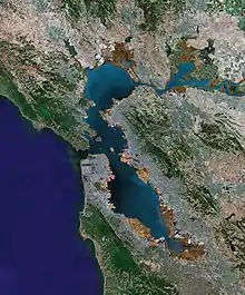 Parts (highlighted in brown) of the San Francisco Bay were reclaimed from wetlands for urban use.