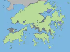 A map of reclaimed land (grey area) in Hong Kong. Many of the urban areas of Hong Kong are on reclaimed land.