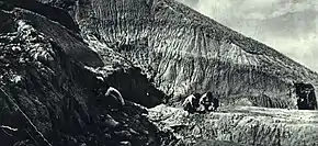 On July 19, 1963, a team funded by the Chinese Institute of Vertebrate Palaeontology and Palaeoanthropology (IVPP) recovered a fossil human mandible (lower jawbone) outside Chenchiawo Village, Lantian County in the Shaanxi Province of Northwest China. It was found in the bottom end of a 30 m (98 ft) thick layer of reddish clays, atop a metre-thick (3 ft) layer of gravel.[1] Lantian is situated on the Loess Plateau, which is geologically stratified into alternating units of loess (wind-blown sediment deposits) and paleosol (soil deposits).[2] The mandible was formally described by Chinese palaeoanthropologist Woo Ju-Kan (吴汝康) in 1964, who noted its similarity to the Peking Man (at the time "Sinanthropus" pekinensis), and provisionally classified it as "Sinanthropus" lantianensis.[1] This spurred further investigation of Lantian County, which recovered a human tooth by the end of the May 1964 and the rest of the skull by October,[3] at the Gongwangling site at the foothills of the Qinling Mountains.[2] Woo also assigned it to "S." lantianensis, but later that year, he recognised the genus was falling out of favour and was being synonymised with Homo erectus. He recommended the combination Homo erectus lantianensis.[4] Nonetheless, the skull is too distorted to morphologically assess Lantian Man's relationship with other H. erectus populations, so it is unclear if Lantian Man and Peking Man are more closely related to each other than Java Man (H. e. erectus).[5]