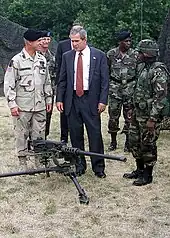 Ellis and U.S. President George W. Bush witness a demonstration of the M2 Browning machine gun in July 2002.