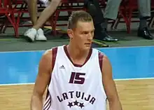 Latvia entered the competition with high hopes, however, their biggest star Kristaps Porziņģis was unable to represent the team during the 2023 FIBA World Cup, due to failing to recover from an injury.[24] Nevertheless, Latvia surprisingly eliminated European vice-champions France in the first round by winning a decisive game 88–86 and qualified to the second round of the 2023 FIBA World Cup with two victories (also versus Lebanon 109–70) and one 101–75 loss to Canada.[25][26] One of the Latvian team leaders Dāvis Bertāns described victory versus France as "the biggest win in Latvian basketball history since 1935".[27] In the second round Latvia achieved yet another memorable 74–69 victory versus the reigning world champions Spain.[28] In the next game Latvia crushed Brazil 104–84 and advanced to the quarter-finals as the second-best team in the group, leaving Spain and Brazil behind without playoffs.[29] But in quarter-final Latvia lost to Germany in the last seconds with the result 79–81 and did not directly qualify for the Paris 2024 Olympics.[30] Latvia finished the tournament in fifth place after defeating Italy (82–87) and Lithuania (98–63).[31][26]
