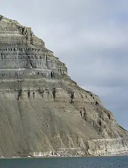 Layer upon layer of rocks on north shore of Isfjord, Svalbard, Norway. Since there is no overturning, the rock at the bottom is older than the rock on the top by the law of superposition.