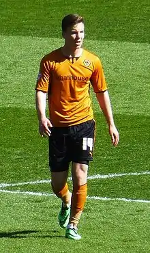 The midfielder made his club and Football League debut on 3 August 2013 in a goalless draw against Preston North End.[11] He scored his first goal for the club a week later when he netted in a 4–0 win against Gillingham.[12] He made 28 appearances during his first full season at Wolves, helping the team on to win the 2013–14 Football League One title.[13]