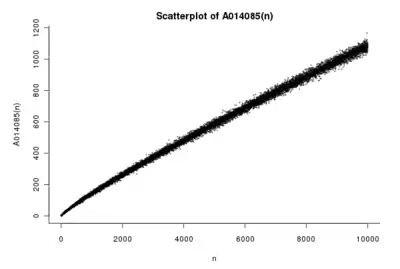 Plot of the number of primes between n2 and (n + 1)2 OEIS: A014085