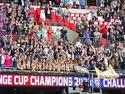 On 22 July 2023 they beat St Helens in the Challenge Cup semi final by 12 points to 10 to reach the Challenge Cup final for the first time since 1971. On 12 August 2023, Leigh played in the Challenge Cup final at Wembley Stadium and beat Hull Kingston Rovers by 17–16 after golden point extra time. A drop goal by Lachlan Lam won the game and the cup for Leigh.[15] Leigh would finish 5th on the table in their first season back in the Super League to qualify for the playoffs. Leigh's season was ended in the elimination final game against Hull Kingston Rovers as they lost 20-6.[16]