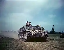 The first 76mm-armed M4A2 diesel-fuel Shermans started to arrive in Soviet Union in the late summer of 1944.[16] By 1945, some Red Army armoured units were standardized to depend primarily on them and not on their ubiquitous T-34. Such units include the 1st Guards Mechanized Corps, the 3rd Guards Mechanized Corps, 6th Guards Tank Army and the 9th Guards Mechanized Corps, amongst others. The Sherman was largely held in good regard and viewed positively by many Soviet tank-crews which operated it before, with compliments mainly given to its reliability, ease of maintenance, generally good firepower (referring especially to the 76mm-gun version) and decent armour protection,[17] as well as an auxiliary power unit (APU) to keep the tank's batteries charged without having to run the main engine for the same purpose as the Soviets' own T-34 tank required.[18]