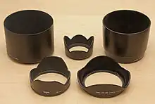The shape of a lens hood can vary from a plain cylindrical or conical section (much like a lamp shade) to a more complex shape, sometimes called a petal, tulip, or flower hood. These more complex shapes take into account the final image's shape and aspect ratio.[3] This allows the lens hood to block stray light with the longer portions of the lens hood, while allowing more light into the corners of the image through the shorter portions of the hood, thereby reducing the amount of mechanical vignetting (reduction of light around the periphery)[4] in the final image.
