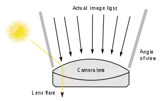 Scheme of a lens with lens flare. A lens hood is designed so that it does not block the angle of view of the lens. Lens hoods block the Sun or other light source(s) to prevent glare and lens flare.