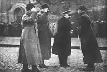 On 10 November 1917, three days after the Soviet seizure of power during the October Revolution, the executive committee of the national railroad labor union, Vikzhel, threatened a nationwide strike unless the Bolsheviks shared power with other socialist parties and dropped the uprising's leaders, Lenin and Trotsky, from the government. Zinoviev, Kamenev and their allies in the Bolshevik Central Committee argued that the Bolsheviks had no choice but to start negotiations, since a railroad strike would cripple their government's ability to fight the forces that were still loyal to the overthrown Provisional Government.[8] Although Zinoviev and Kamenev briefly had the support of a Central Committee majority and negotiations were started, a quick collapse of the anti-Bolshevik forces outside Petrograd aided Lenin and Trotsky to convince the Central Committee to abandon the negotiating process. In response, Zinoviev, Kamenev, Alexei Rykov, Vladimir Milyutin and Victor Nogin resigned from the Central Committee on 4 November 1917 (Old Style) and Kamenev resigned from his Central Executive Committee post. The following day, Lenin wrote a proclamation calling Zinoviev and Kamenev "deserters."[9] He never forgot their behavior, eventually making an ambiguous reference to their "October episode" in his Testament.