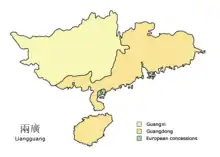 Liangguang (traditional Chinese: 兩廣; simplified Chinese: 两广; pinyin: Liǎngguǎng; Cantonese Yale: Léuhng Gwóng; "the Two Expanses"; Postal romanization: Liangkwang) is a Chinese term for the province of Guangdong and the former province and present autonomous region of Guangxi, collectively. It particularly refers to the viceroyalty of Liangguang under the Qing dynasty, when the territory was considered to include Hainan and the leased territories of British Hong Kong, the French Kouang-Tchéou-Wan and Portuguese Macau. The Viceroyalty of Liangguang existed from 1735 to 1911.