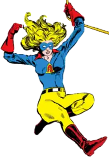 Now a mystery-woman, the Liberty Belle becomes involved in the founding of the All-Star Squadron. On December 8, 1941 she is present, with a handful of other mystery-men, in the White House when President Roosevelt announces his order that the Justice Society of America mobilize all American costumed heroes into a single unit, an All-Star Squadron, responsible directly to the President. Their first mission is to fly to the West Coast, search out any saboteurs and prevent a Japanese attack on the U.S. mainland.[9] They find the JSA have been captured by the time travelling villain Per Degaton, who is planning to change the events in an attempt at world domination. They stopped this, though when Per Degaton went back to 1947, they forgot his involvement. Soon after, the core members of the All-Star Squadron, including Libby, begin the process of electing other mystery-men for membership. During the meeting, the matter of electing a permanent chairman is decided by secret ballot, and the Liberty Belle receives the majority vote.[10]