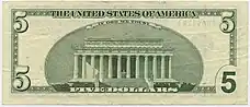 The memorial has appeared on the back of the U.S. five-dollar bill since 1929.[61] The front of the bill bears Lincoln's portrait.